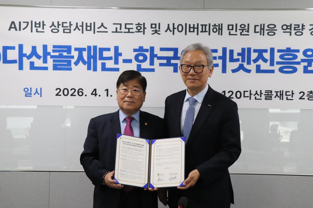 지난 4월 1일, 120다산콜재단은 한국인터넷진흥원(원장 이상중)과 AI 기반 상담혁신 및 사이버피해 대응 협력을 위한 업무협약을 체결했습니다.이번 업무협약을 통해 120다산콜재단과 한국인터넷진흥원은 유기적 협력체계 구축을 통한 사이버 피해 민원의 신속한 연계 및 지원, AI 기반 상담 서비스 운영 노하우 공유, 고품질 학습데이터를 활용한 AI 상담서비스 품질 향상 등에 대해 업무 협력을 약속했습니다.앞으로도 120은 시민이 만족할 수 있는 스마트 상담 환경을 조성하는 데 최선을 다하겠습니다.2026-04-09